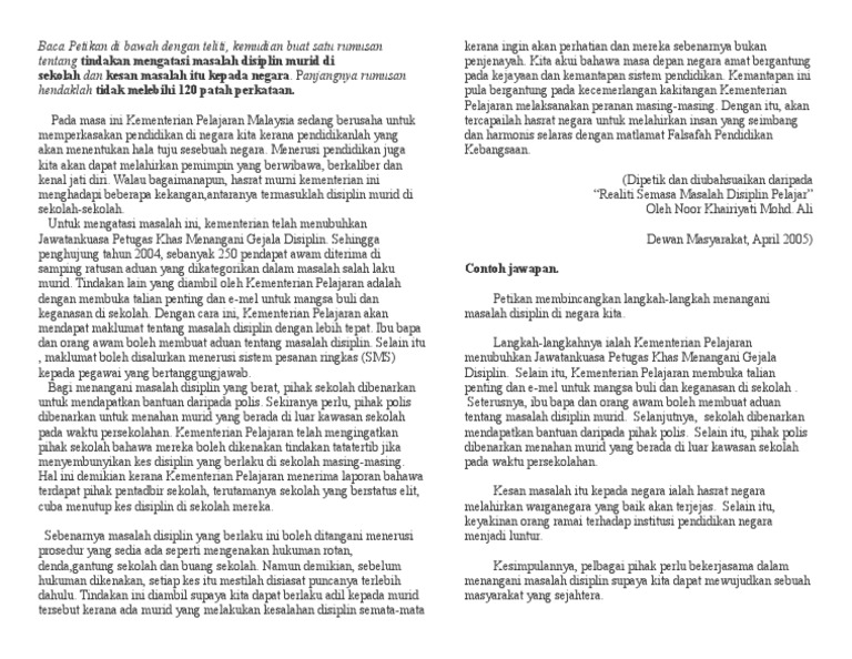 Isu Disiplin Di Sekolah PENDAHULUAN Di sekolah disiplin menjadi satu daya kawalan sosial bagi mewujudkan suasana yang tenteram dan keadaan yang teratur agar proses pengajaran dan pembelajaran dapat berjalan dengan licin dan lancar. Koleksi Trial Esei Semester 1 2021. Mempengaruhi dan kesannya terhadap kakitangan tersebut serta jabatan Polis Kontinjen Selangor.