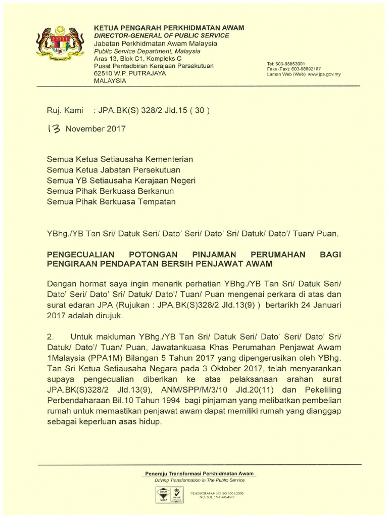 Pekeliling Pengecualian Potongan Pinjaman Perumahan Bagi Pengiraan Pendapatan Bersih Penjawat Awam Pdf