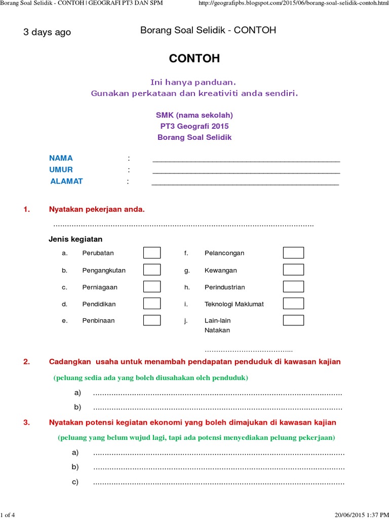 Contoh rasmi borang soal selidik tugasan geografi pt3 2015 kegiatan ekonomi. Contoh borang soal. Panduan buat pelajar tingkatan 3 yang ingin menyiapkan tugas kerja kursus geografi pt3.