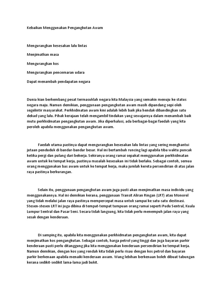 Oleh itu kerajaan haruslah melaksanakan sistem tiket bersepadu dengan harga yang mampu dibeli oleh orang ramai khususnya mereka yang berpendapatan rendah supaya dapat menggalakkan orang ramai menggunakan pengangkutan awam. Kebaikan Menggunakan Kenderaan Awam Karangan Dunia kian berkembang pesat termasuklah negara kita Malaysia yang semakin menuju ke status negara maju. Kenderaan bermotor terutama kenderaan yang menggunakan petrol berplumbum dan kenderaan diesel menyebabkan pencemaran udara berlaku.